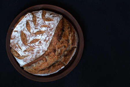 Homemade round dark bread with flour crust and painted spikelet on a clay plate. Top view with copy space
