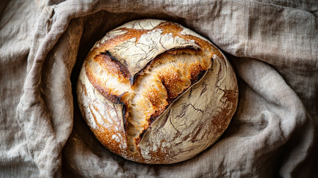 Freshly baked sourdough bread on rustic tablecloth.