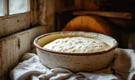 Rustic homemade bread rising in a bowl by a kitchen window. That the image is generated using AI.