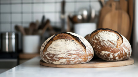 Two artisanal sourdough loaves rest on a wooden board in a modern kitchen. The setting features elegant utensils and a clean aesthetic, showing the baking process