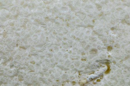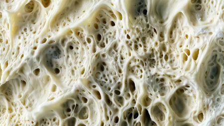 Sourdough Starter Texture. Close-up of a bubbly, porous sourdough starter with intricate gluten strands and gas pockets formed during fermentation.