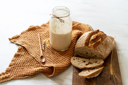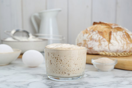 Glass jar with sourdough on white marble table
