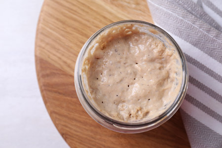 Sourdough starter in glass jar on light table, top view