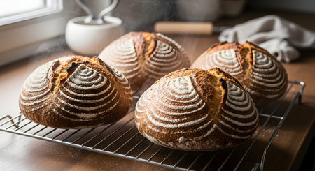 Three loaves of freshly baked sourdough bread cool on a wire rack, releasing steam into the sunlit kitchen air. The crusty, artisan loaves feature beautiful scoring patterns, highlighting the art of homemade baking.