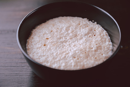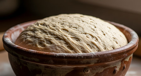 Bread dough in a ceramic dish, rustic feel