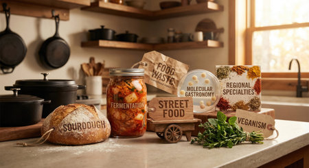 Tag cloud on the theme of diverse food trends and culinary concepts, including sourdough, fermentation, and veganism