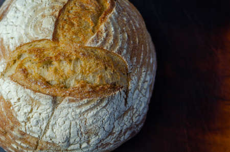 Baked bread of sourdough. Bread crust. Close up. The bread of sourdough, homemade and natural creation. The sourdough has natural yeast, which makes the food healthier, as well as rich.