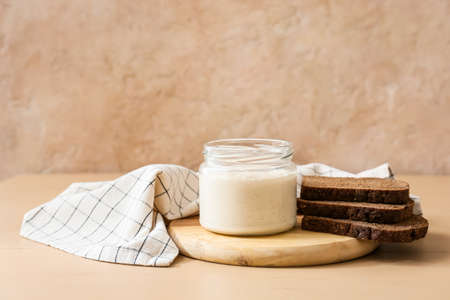Jar with fresh sourdough and bread slices on table