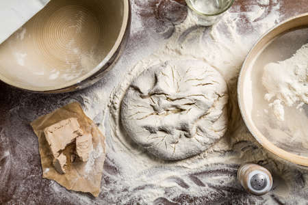 dough in a jar, natural rye flour with rolling pin and wooden plate, ready to bake