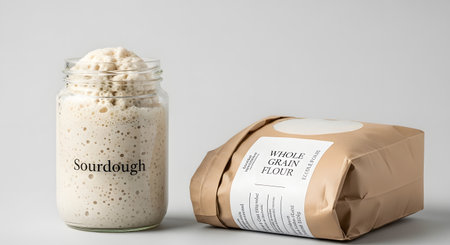 A bubbly and active sourdough starter in a labeled glass jar next to a paper bag of whole grain flour. Minimalist composition for baking and cooking concepts.
