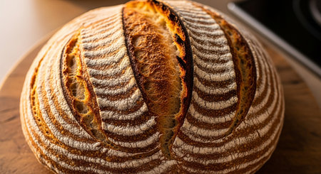 Freshly baked sourdough bread on wooden table. Selective focus.