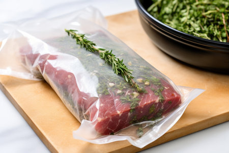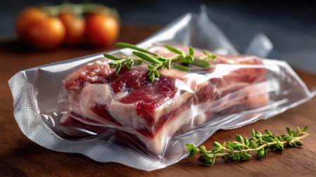 This image features fresh vacuum-sealed meat displayed on a wooden cutting board, garnished with herbs. Ideal for showcasing culinary preparations and delicious recipes.