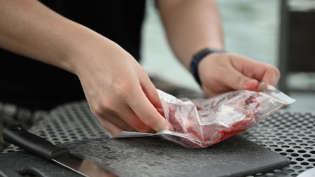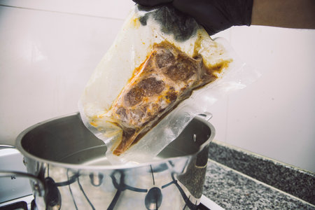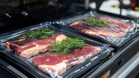 A skilled cook prepares fresh cuts of meat by vacuum sealing them for optimal freshness and flavor retention, showcasing modern culinary techniques in a well-designed kitchen space.