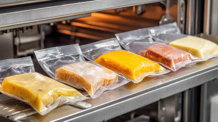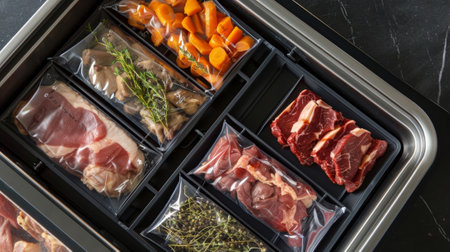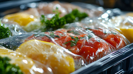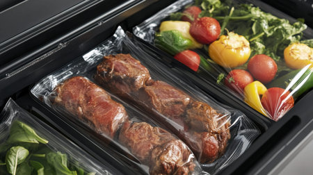 This image showcases vacuum sealed bags containing fresh meat and colorful vegetables, highlighting convenient food preparation and storage for meal planning.