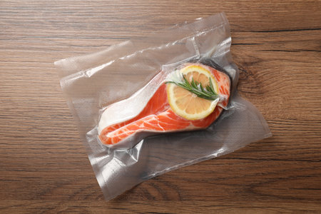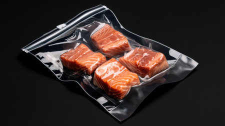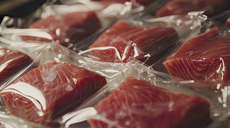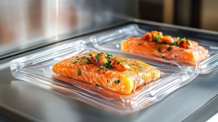 Fresh salmon fillets vacuum sealed in clear packaging showcase their vibrant color and texture. Perfect for maintaining freshness and quality in culinary applications.