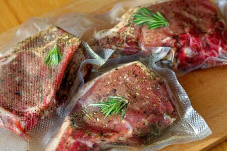 A close-up view of fresh raw beef cuts vacuum sealed in clear packaging, showcasing quality and presentation for culinary enthusiasts and chefs.