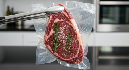 A prime cut of ribeye steak, seasoned with fresh herbs, is held in a vacuum-sealed bag, awaiting culinary transformation.