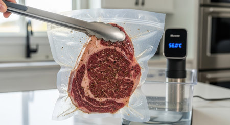 A raw ribeye steak is held by tongs above a vacuum-sealed bag next to a sous vide immersion circulator.