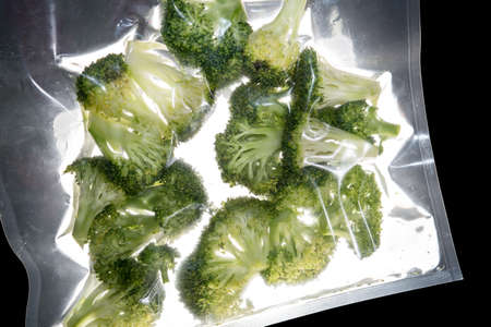 broccoli vegetable vacuum packed sealed for sous vide cooking.backlight on black background