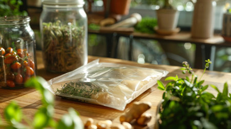 freezer bag with raw steak and herb rub inside, created with generative ai