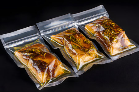 Vacuum-sealed packs of marinated salmon ready for storage and cooking