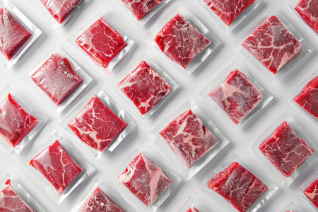 A creative composition of frozen meat displayed in a visually striking pattern, highlighting their packaging and presentation. --ar 3:2 --v 6 Job ID: eec0e2b3-6aec-4eb5-8d1a-91408ae9b747