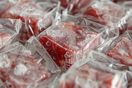 A close-up shot of frozen beef cuts wrapped in plastic, highlighting the texture of the meat and the cold condensation on the packaging. --ar 3:2 --v 6 Job ID: fc91a80d-300e-48dd-9e53-6a00dbcca8ad