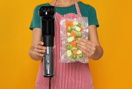 Woman holding sous vide cooker and vegetables in vacuum pack on orange background, closeup