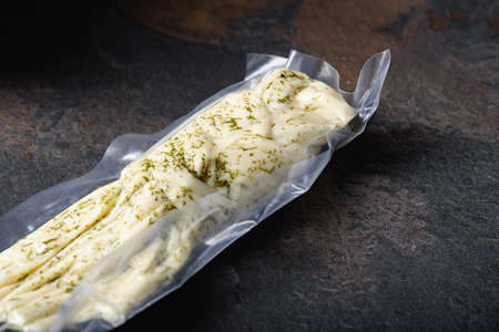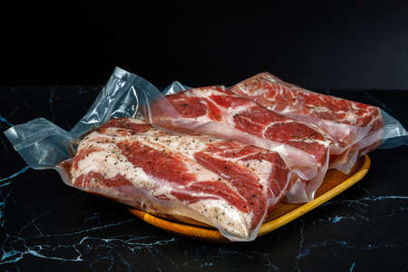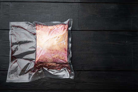 Top blade steak, vacuum packed organic beef for sous vide cooking on black textured background, top view