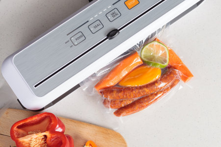 Vacuum food sealer machine sealing a bag of mixed vegetables and sausages on a kitchen counter.