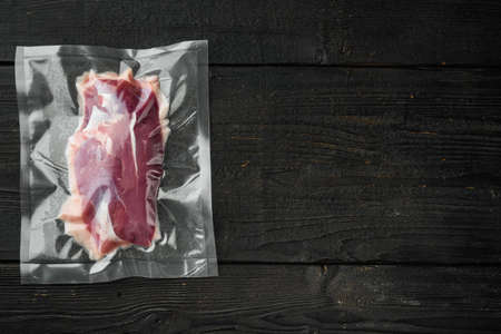 Marbled raw beef steak cut in vacuum pack, on black wooden table, top view, with copy space for text