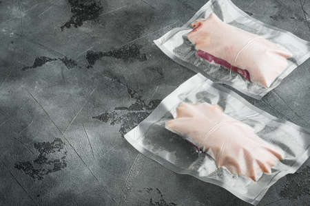 Raw duck breast in seal bag for sous vide cooking set, on gray stone background, with copyspace and space for text