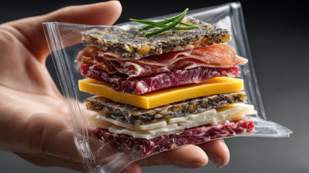 A hand holds a transparent bag containing a colorful stack of gourmet cured meats and cheeses, highlighting rich textures and vibrant colors.