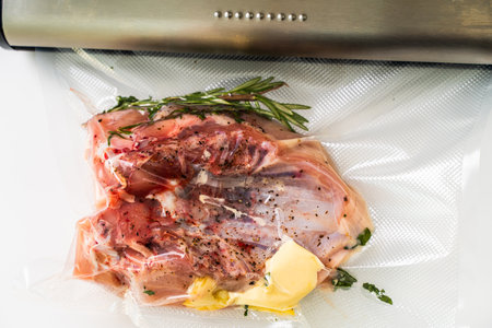 The process of preparing chicken breast using the sous vide method. Chicken marinated with herbs in a vacuum-sealed bag and a vacuum sealer on a white background. High quality photo