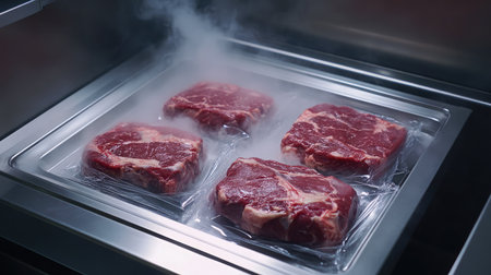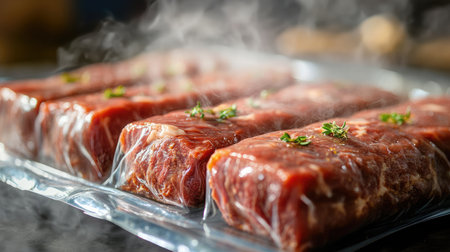 Fresh beef slices aligned under vacuum sealer with warm steam rising from sealing rails