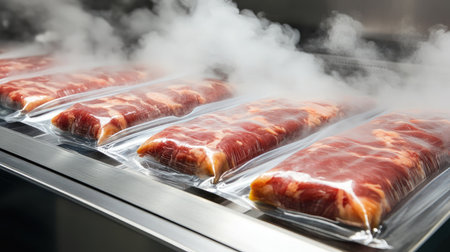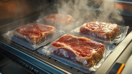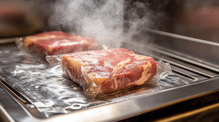 Fresh slices of meat in vacuum pouches undergoing heat sealing in steamy chamber