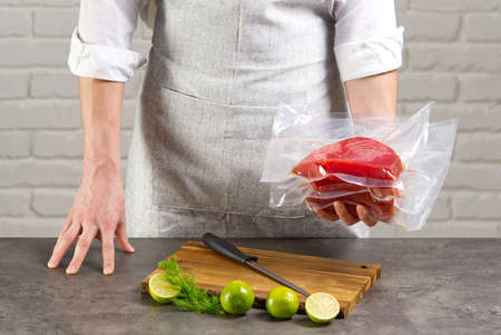 A man is holding a vacuum-packed red fish. Beautiful tuna.