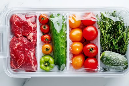 Fresh meat and vibrant vegetables neatly organized in clear storage container. Ideal for meal prep or healthy cooking. Concept of culinary arts, food preservation, nutrition.