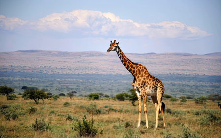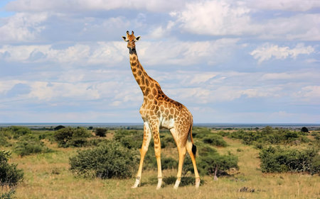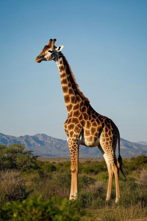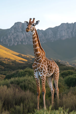A stunning giraffe gracefully poses in the golden savannah, surrounded by lush greenery and distant hills. This captivating image captures the essence of wildlife, showcasing the giraffes elegant stature and unique patterns against a serene backdrop.