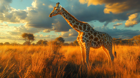A majestic giraffe stands tall in a golden savanna landscape with acacia trees in the distance. The warm light of the setting sun bathes the scene in a soft, atmospheric glow.