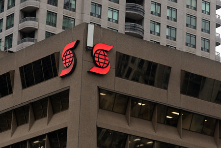 Toronto, ON, Canada – December 17, 2022: The logo and brand sign of Scotiabank in downtown Toronto. The Bank of Nova Scotia (Scotiabank) is a Canadian multinational banking and financial services company