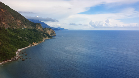 An aerial beautiful shot of forested cliffs near a blue clear ocean