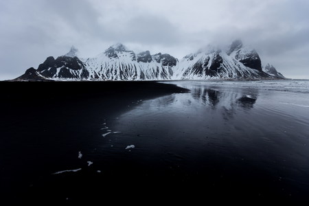 Beautiful black sand beach in winter at Vestrahorn in Iceland