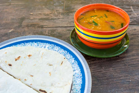 Bowl of tasty soup. Traditional meal with chapati bread.