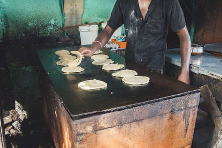 Traditional street food vendor. Man cooks and inverts indian flatbreads, roti or chapati, served with curry. Morning breakfast time. unsanitary conditions. unhygienic, insanitary