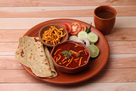 Dhaba style Sev bhaji/sabzi/curry made in tomato curry with gathiya shev, served with chapati/ roti.