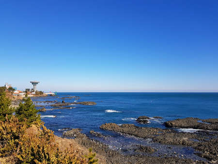 Jeju-do, Seopjikoji cape landscape with lighthouse and sea, east coast of Jeju Island, South Korea, Seongsan-ri, Seogwipo, Jeju Province view in a sunny day, with sea and cliffs