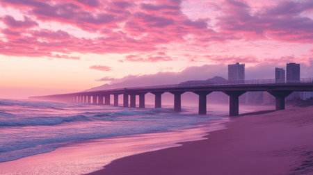 A stunning beach sunset view showcasing a long pier over gentle waves. The sky glows with pink hues, creating a serene atmosphere perfect for relaxation.