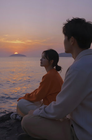 A young Asian woman with short hair looks thoughtfully towards the horizon during a serene sunset, capturing a moment of reflection and peace.