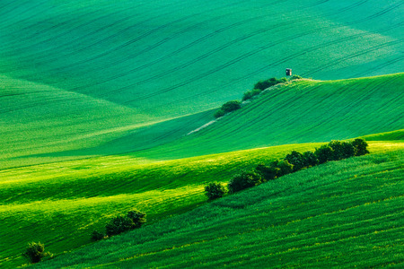 Rolling hills of green wheat fields. Amazing fairy minimalistic landscape with waves hills, rolling hills. Abstract nature background. South Moravia, Czech Republic